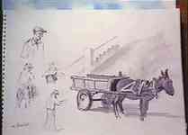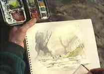 selects the sketch of the bridge from which to paint a finished watercolour