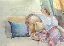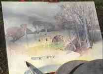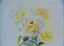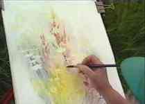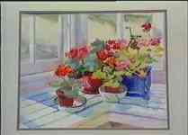 flower painting - pot plants indoors, and a single bloom, herbaceous border